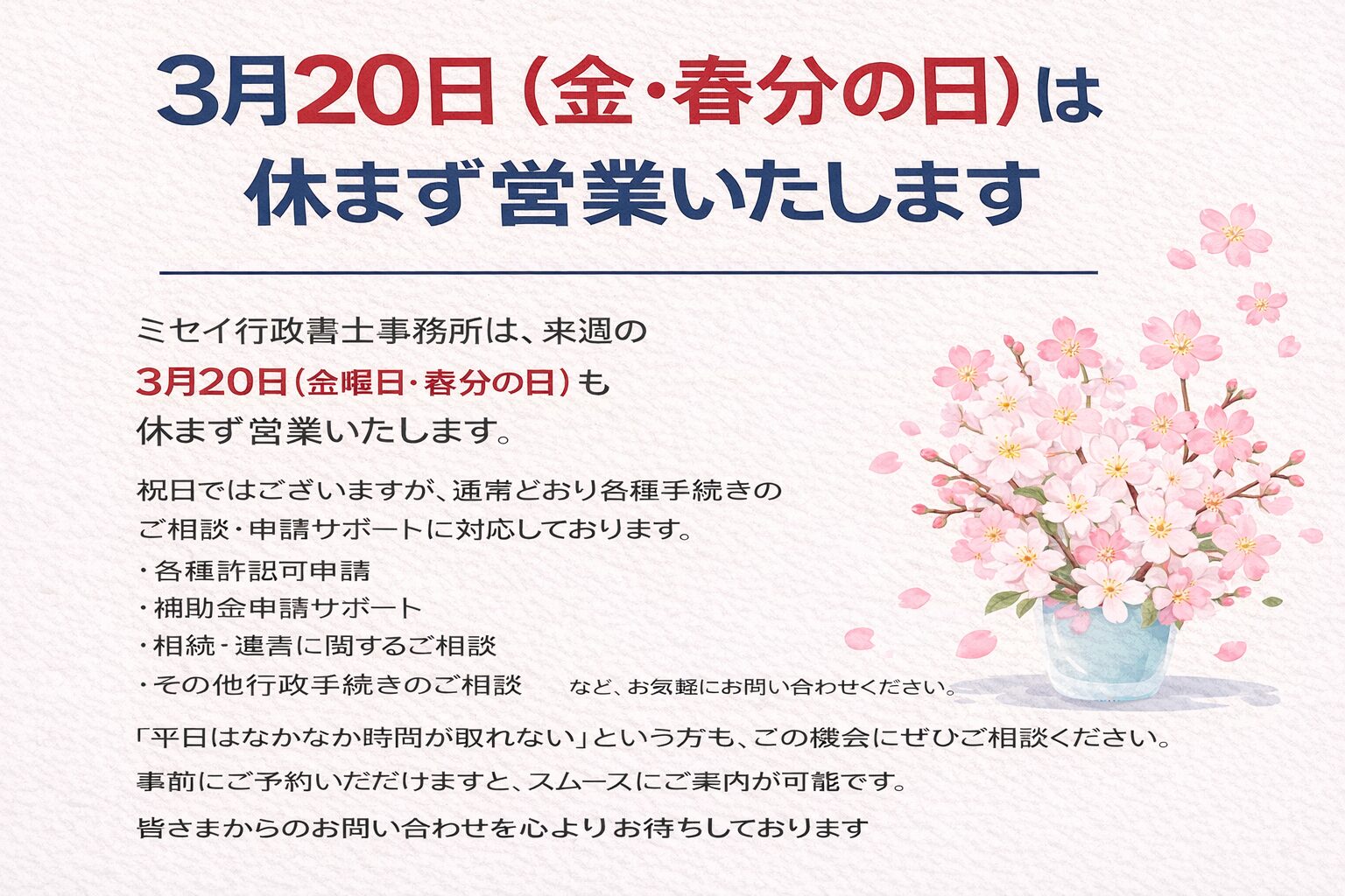 ミセイ行政書士事務所は、来週の**3月20日(金曜日・春分の日)**も休まず営業いたします。