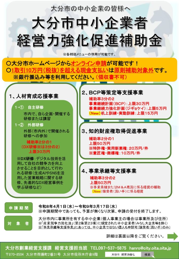 大分市より、令和8年度の「中小企業者経営力強化促進補助金」の公募が開始されました。