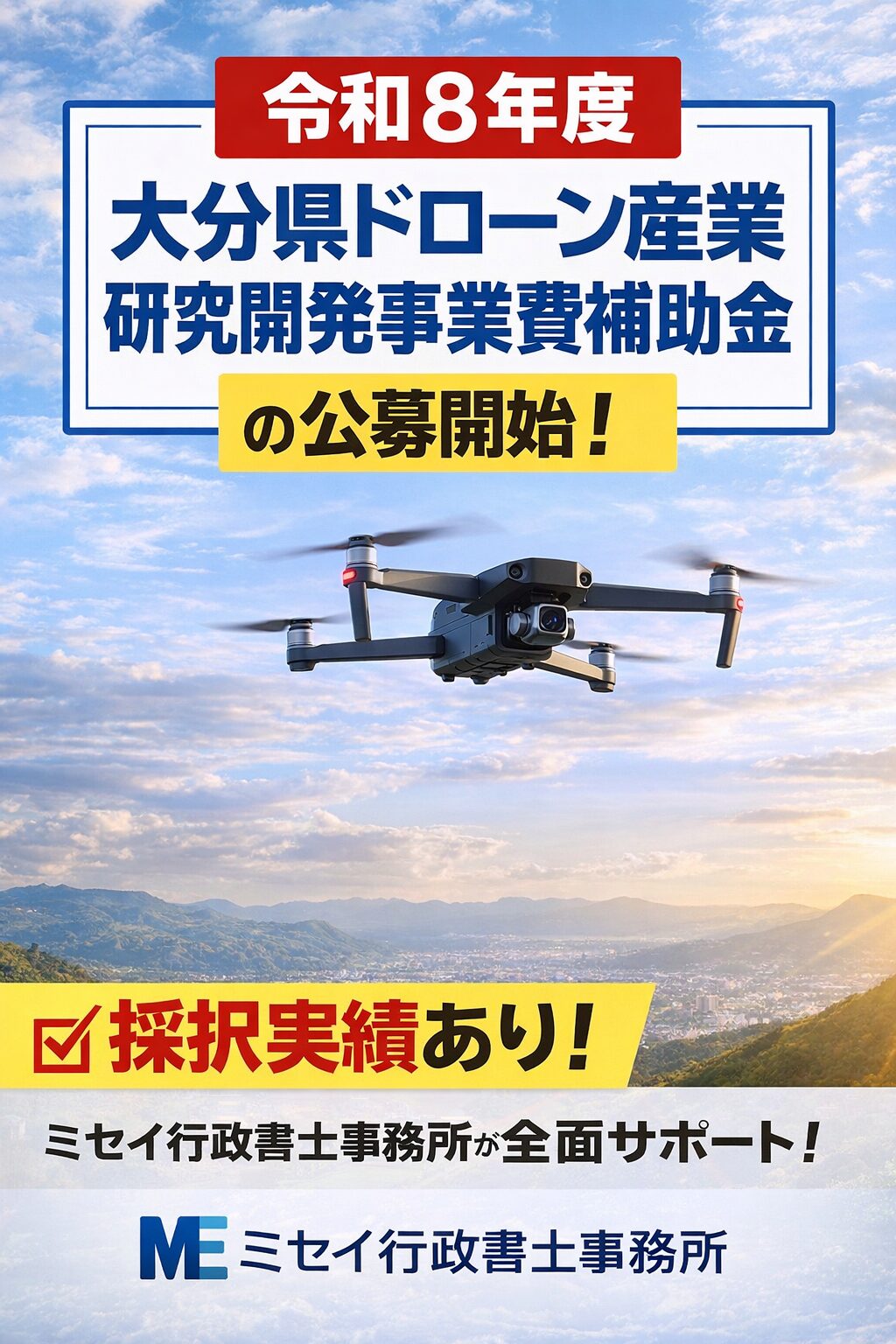 ミセイ行政書士事務所では、昨年度(令和7年度)、大分県ドローン産業研究開発事業費補助金を1件採択させております。
