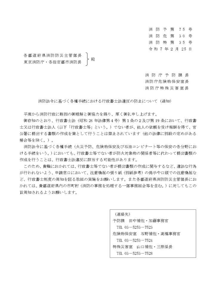 令和7年2月25日、消防庁から「消防法令に基づく各種手続における行政書士法違反の防止について(通知)」が全国の消防機関へ発出されました。