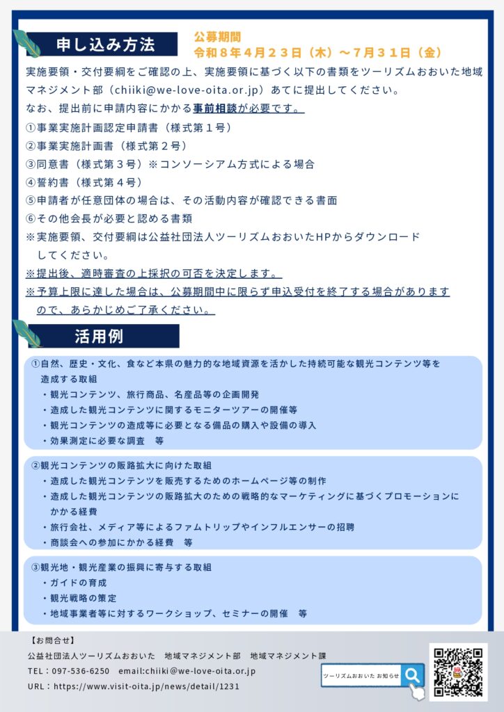 令和8年度「大分県観光地域づくり共創事業費補助金」の公募が開始されました。