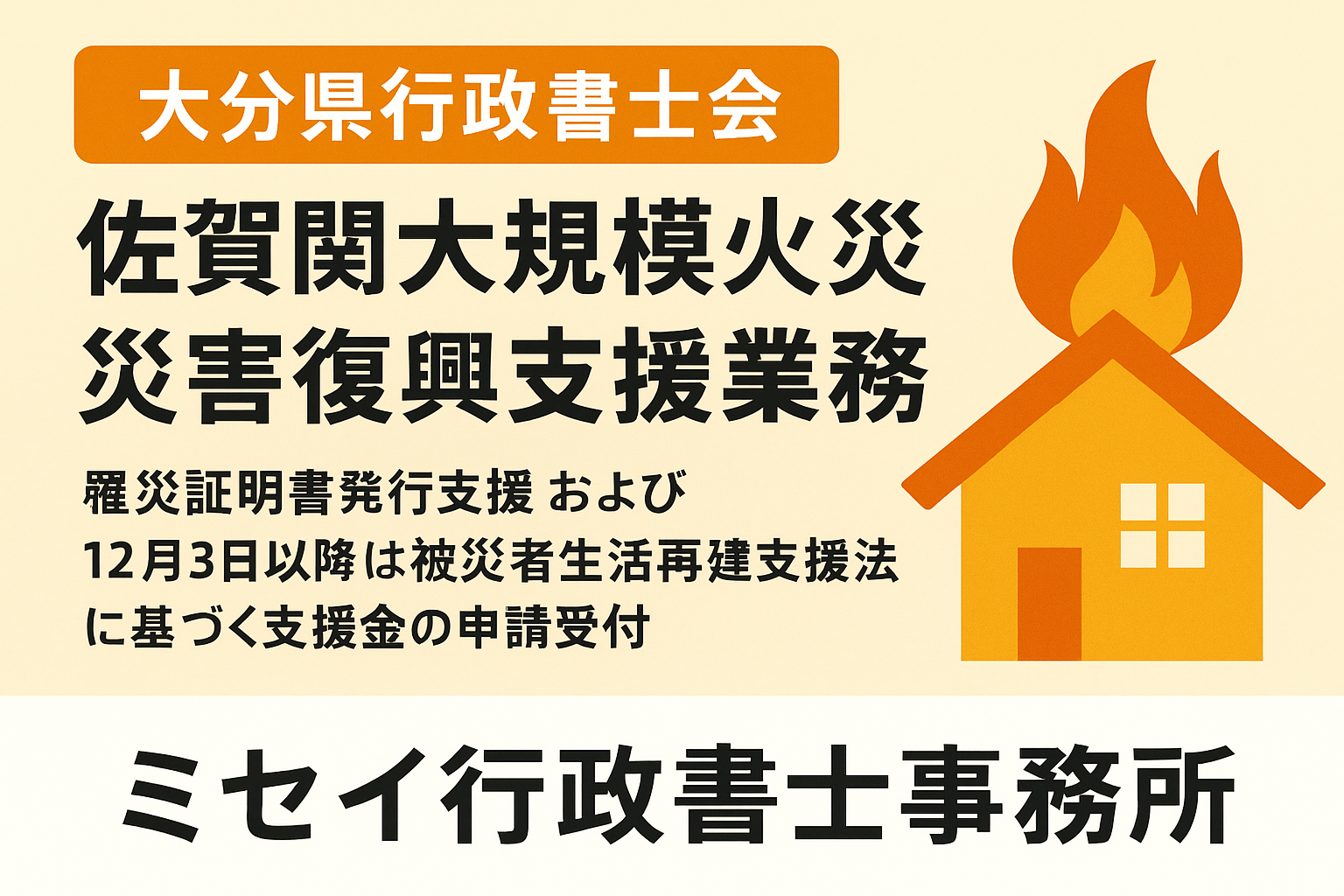 行政書士による支援業務は、「罹災証明書発行支援」そして12月3日以降は、「被災者生活再建支援法に基づく支援金」(上限300万円)の給付申請受付の業務を開始します。