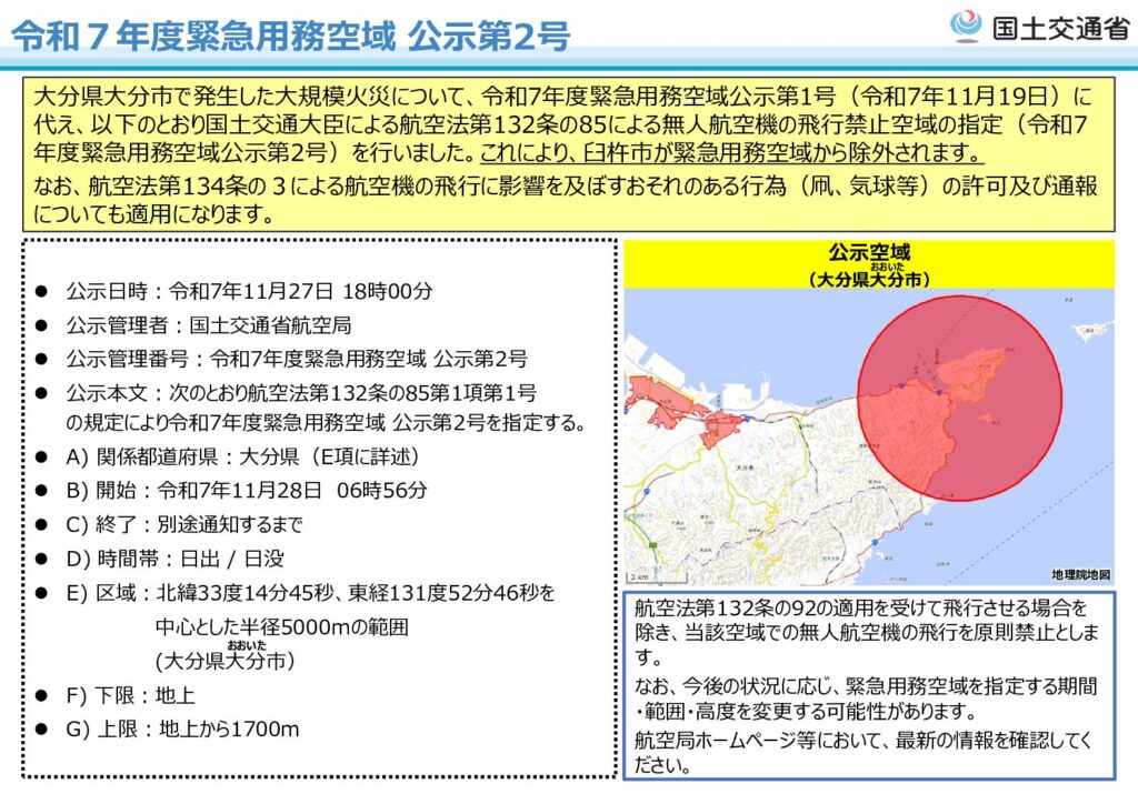 令和7年11月18日に大分県大分市佐賀関で発生した火災に関連し、国土交通省より新たに「緊急用務空域 公示第2号」が発出されました(令和7年11月27日18時00分付)。