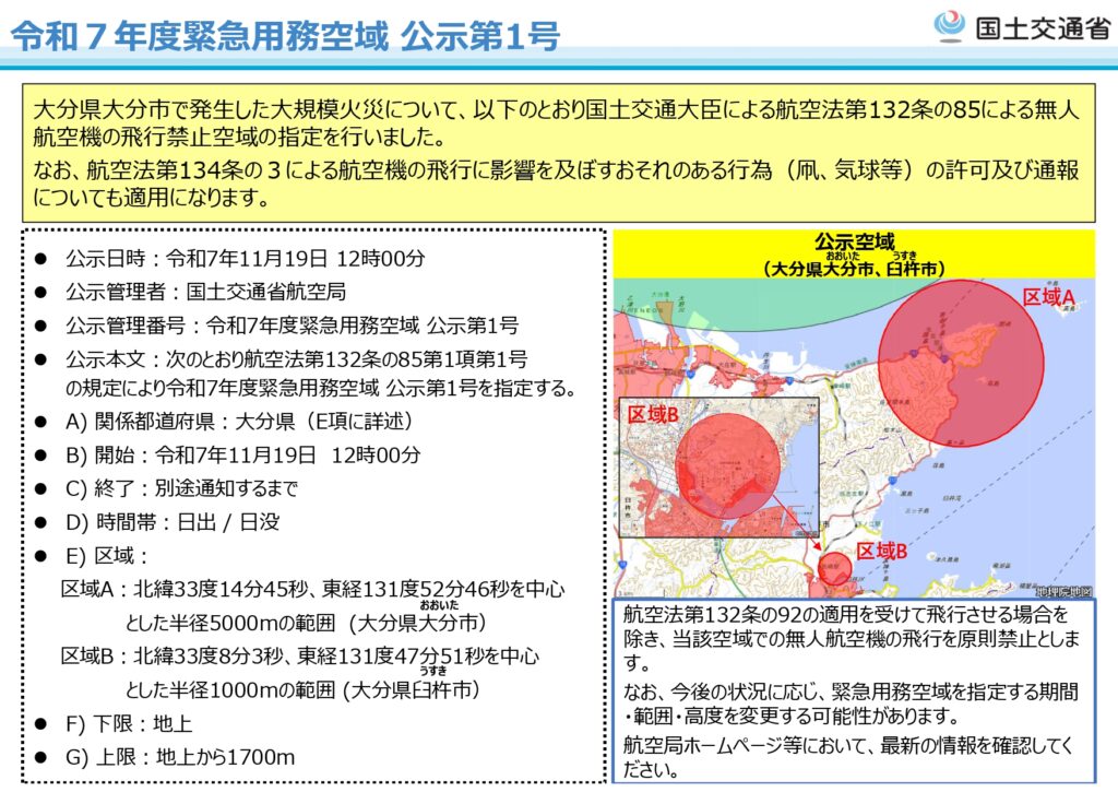 令和7年11月18日に大分県大分市佐賀関で発生した大規模火災に関連し、国土交通省より「緊急用務空域」が指定されました。