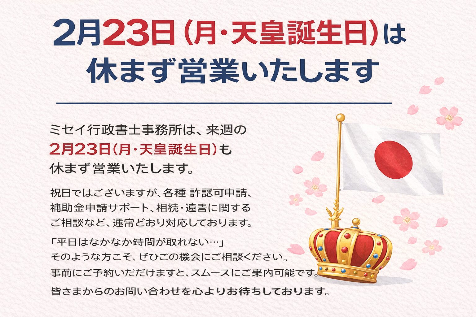 2月23日(月・天皇誕生日)も休まず営業いたします。