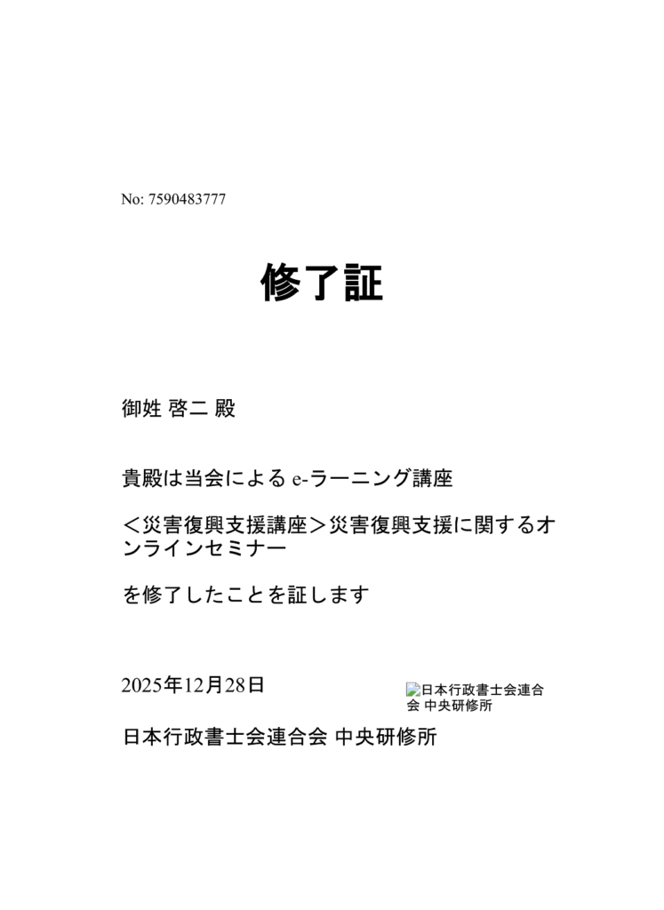 日本行政書士会連合会が設置する「災害復興支援員」として登録されています。