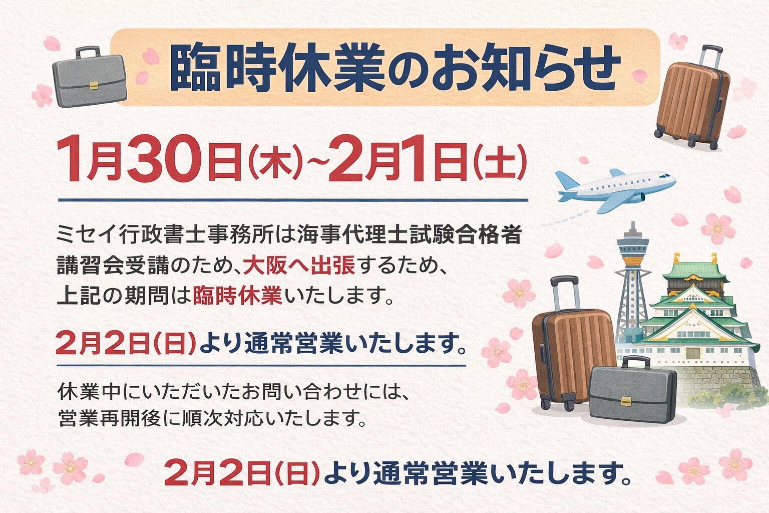お知らせミセイ行政書士事務所は、海事代理士試験合格者講習会受講のため、大阪へ出張いたします。