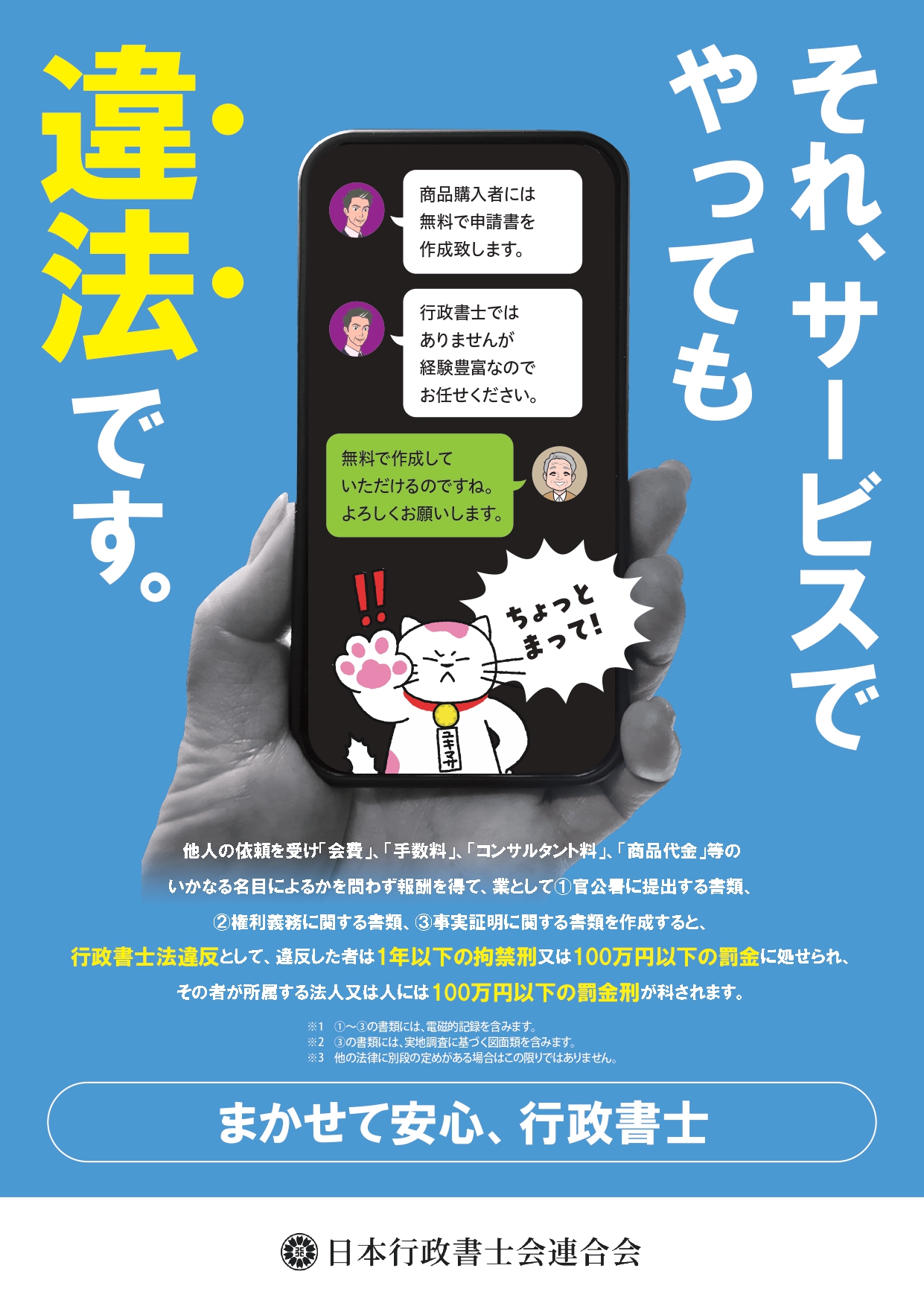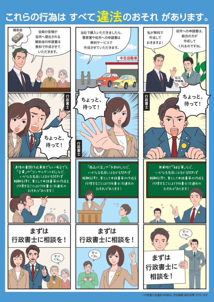 日本行政書士会連合会が作成した非行政書士による違法業務への注意喚起チラシです。
