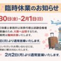 お知らせ本日30日(金)より、営業しております。 台風10号の接近に伴い、昨日は終日閉所させていただきました。申し訳ありませんでした。本日より営業を再開いたします。よろしくお願いいたします。2024.08.30お知らせ