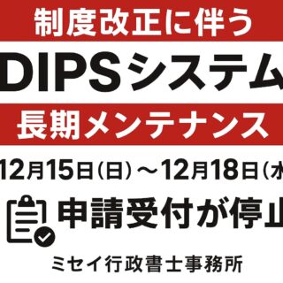 お知らせ制度改正に伴うDIPSシステム長期メンテナンスのお知らせ 制度改正に伴うDIPS2.0改修により12月15日〜18日は申請受付が停止します。飛行許可・承認申請をご予定の方は早めの手続きをおすすめします。ミセイ行政書士事務所がサポートします。2025.12.09お知らせ業務