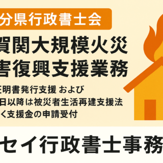 お知らせ佐賀関大規模火災に伴う大分県行政書士会の支援について 大分市佐賀関の大規模火災を受け、大分県行政書士会が罹災証明や支援金申請の受付を開始。ミセイ行政書士事務所も会員として被災者支援に参加し、復興を全力で支援します。2025.12.06お知らせ業務