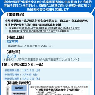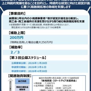 業務【令和7年度 第3回】小規模事業者持続化補助金(通常枠)のご案内 令和7年度第19回小規模事業者持続化補助金(通常枠)の概要を解説。補助率2/3、上限50万円(特例最大250万円)。対象要件や特例制度、申請スケジュール、採択ポイントまで分かりやすくご案内します。2026.02.11業務