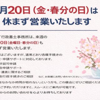 ミセイ行政書士事務所は、3月20日(金・春分の日)も休まず営業いたします。祝日でも通常どおり各種許認可申請、補助金申請サポート、相続・遺言のご相談に対応しております。お気軽にお問い合わせください。